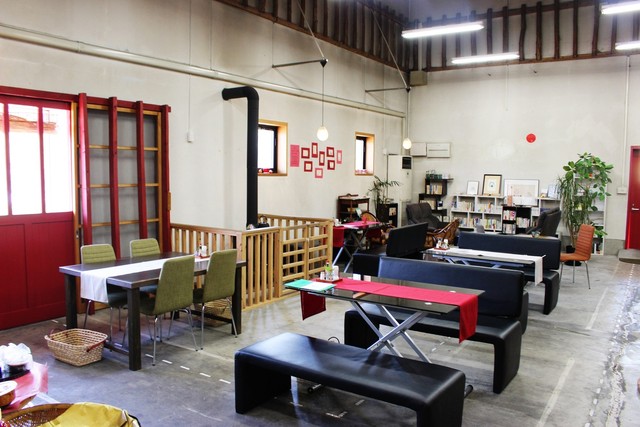 大分の中心地より車で約30分(わさだタウンより車で約15分)です。築57年の農協米倉庫を改装したTUKURU & CAFEは、野津原の田園風景の中に包まれるようにポツリと位置しており、日常を少しだけ離れて広々とした空間で食の大切さを見直す体験と自分の手で動かして作る楽しさを再確認させる体験型の大人から子供までワクワクできる新しい試み満載のカフェです。ツツジやカエデに風を感じる石畳の小道を抜けて、シ...ンボルの赤い木製の扉をくぐると、7メートルもの高さがある天井に圧倒されてしまいます。そして、あとから薪の香りが懐かしく胸に流れ込んくるのです。そして70坪のスペースにたった8席のゆったりとしたカフェスペースになっています。