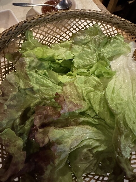 人気メニューだけあって、味のあるバラ肉塩豚チャーシューをサニーレタス、キムチやニンニクなどを巻いて食べる。