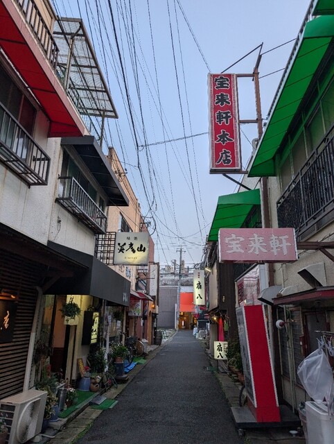 中津駅近くの日之出町商店街にある居酒屋さん「ひのでグリル」「くうとん」から右側路地へ「宝来軒本店」の隣にあります