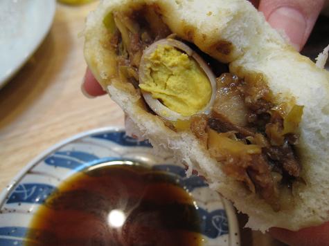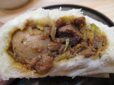 その、アッツアツの豚まんが最初のフォトです。外の皮は、う〜ん、モッチリしています。そして、やっぱり、「山珍」の豚まんといったら、その中身が独特ですね。