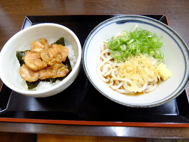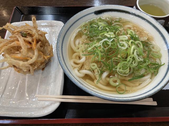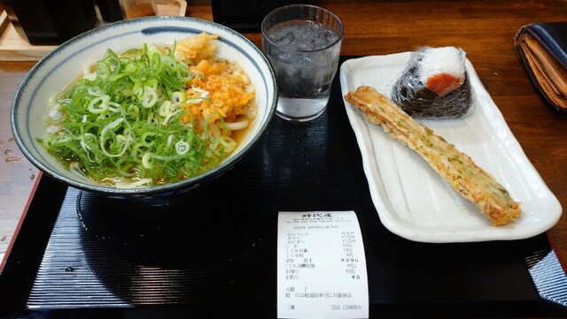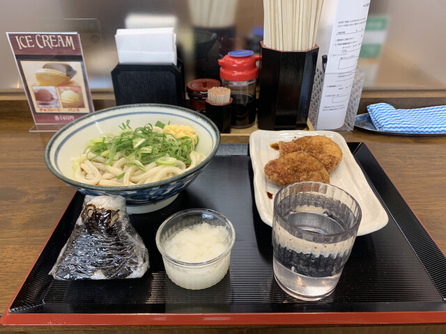 注文は「かけうどん」+かき揚げ&昆布おにぎり...定番ながら安定感ある組み合わせ、これでほぼワンコインなので...