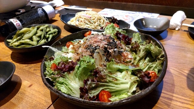 サラダ、枝豆、パスタ、鍋、焼鳥、唐揚げ、〆の雑炊、デザートなどなど。