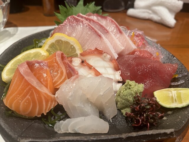 一人でも飲み放題OKということで地酒も全て飲めるプレミアムな飲み放題を。これが運の尽きでした。刺身の盛り合わせ(サーモン、ハマチ、タコ、マグロ、マダイと説明も丁寧。全部わかるけど)
