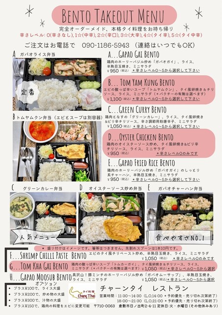 火・水曜、12/30-1/2は休みです。売り切れ次第終了です。メニューを決めて、お電話でご確認下さい。 **重要**昼の営業時間中はランチメニュー、夜はディナーメニューからのご注文となります。事前注文が必要な夜の料理は、一度に3つまでご注文可能です(ガオマンガイ、パッタイ、ソムタム等)。お問い合わせ:090-1186-5943*昼、夜ともに売り切れ次第受付終了します。お早めの予約が確実です!