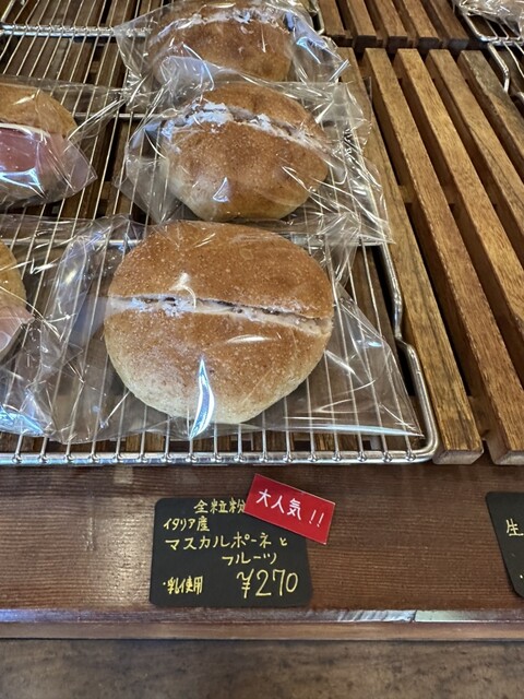 全粒粉のパンが人気なようで、全粒粉のパンにマスカルポーネとフルーツのクリームが入った一品を購入。