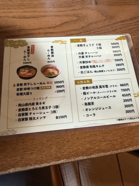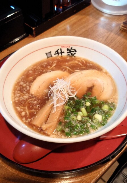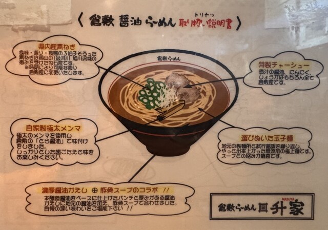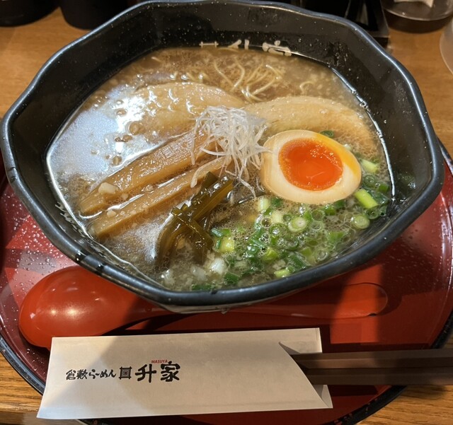 翌日の仕事の関係で、前日夜に倉敷入り。倉敷駅周辺で検索すると升家がヒット!営業時間ギリギリ滑り込みセーフ。名物の「倉敷煮干しラーメン」をいただく。非常にマイルドで食べやすい煮干しラーメン。当日は青ネギ...