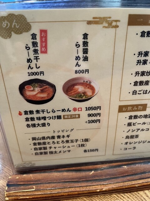 倉敷美観地区に位置し主に倉敷や地元の食材を使った倉敷らーめん(煮干し・醤油)は是非お奨め!