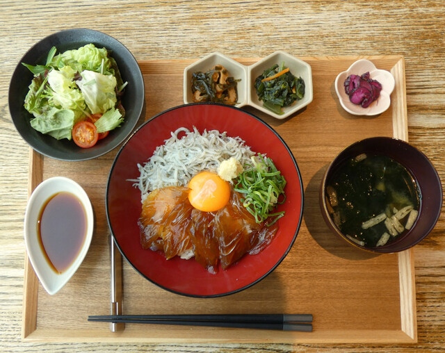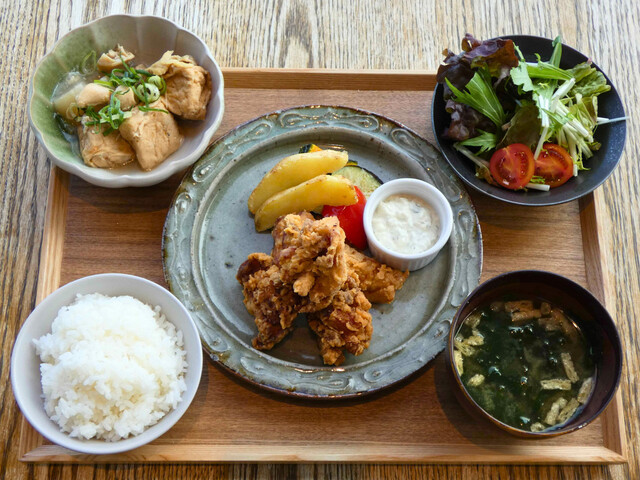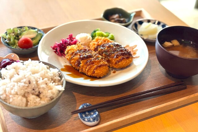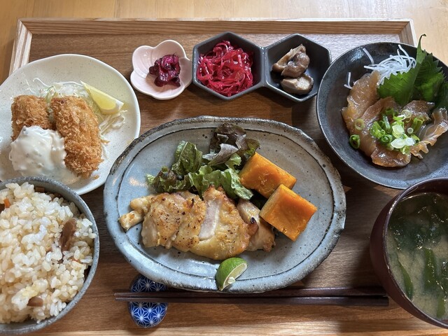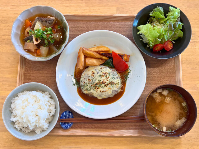 お隣の直売所で販売しているお野菜や鮮魚、その他岡山県産の食材をふんだんに使用したお惣菜定食や、玉野名産の雑穀を使ったお稲荷さん、自家製スイーツをお楽しみいただけます。