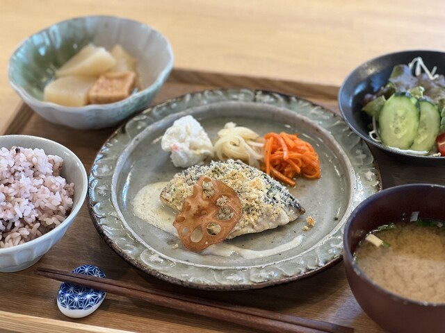 瀬戸内地魚定食を注文しました。本日のお魚はさわらのグリルです。ごはんは残念ながら雑穀米が品切れとのことで白ごはんを選択しました。