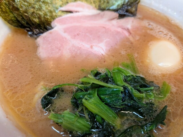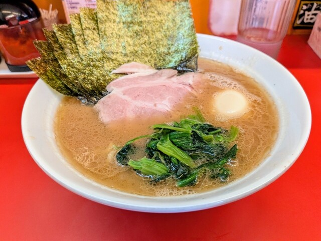 板海苔が衝立の様に7枚そびえ立ち、ほうれん草と味玉丸1個。家系王道な具材。