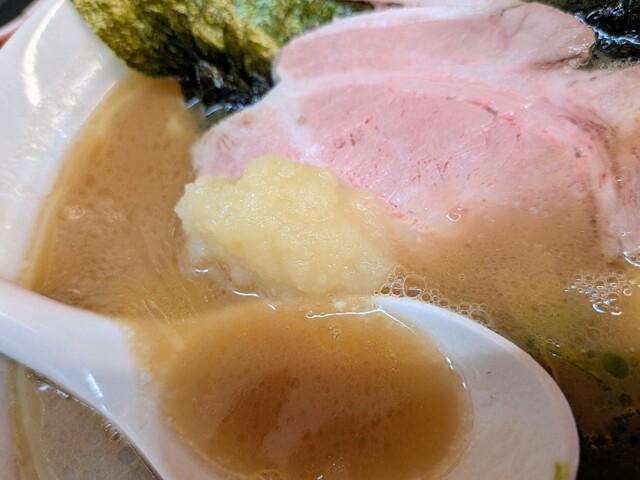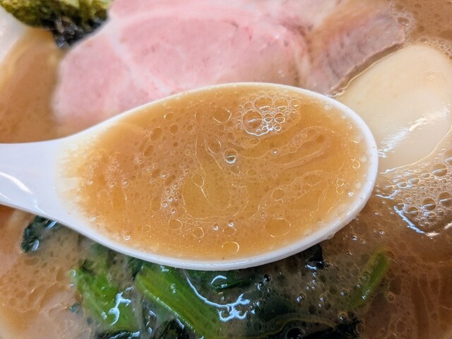 脂がギトギトのスープ表面。これでも普通の量、多めにしたら歳的に無理そう。乳化した豚骨醤油スープ、とっ...