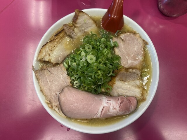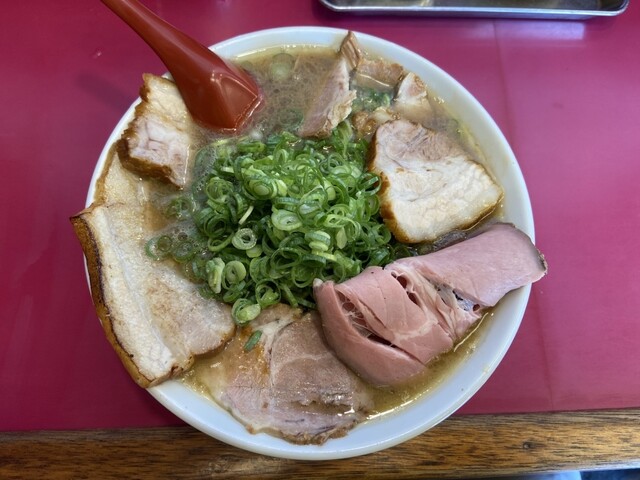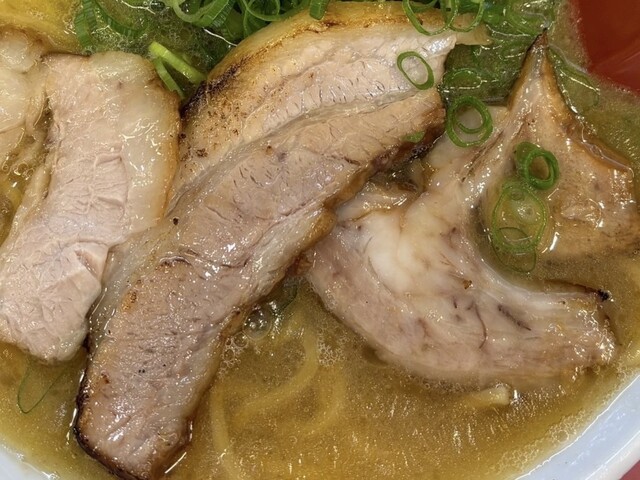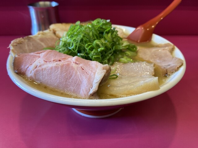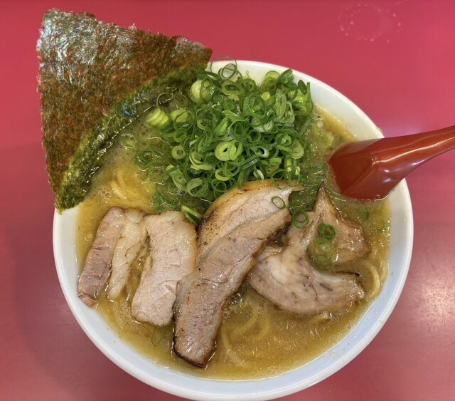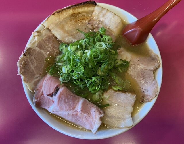 豚バラチャーシュー、豚バラチャーシュー細長、豚肩煮チャーシュー、青ネギたっぷり、もやし、海苔