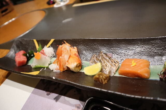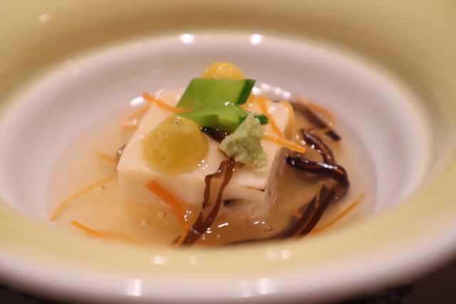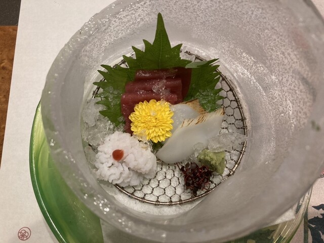 前菜からお造り。灯篭型の氷を叩いて中のお刺身をいただきます。氷を木槌で砕くのが新鮮でした。涼しげで面白かったです。