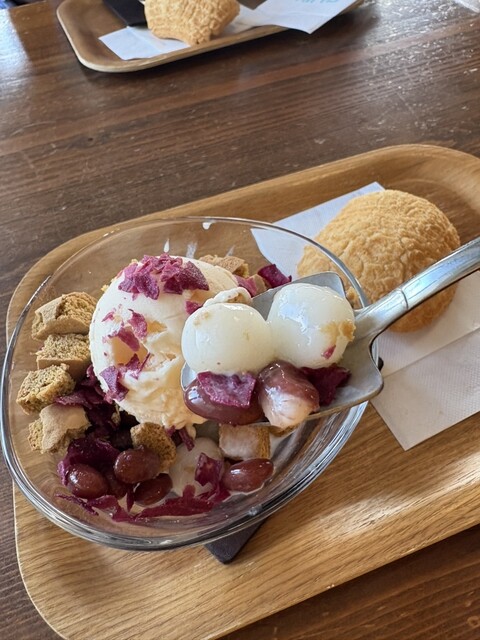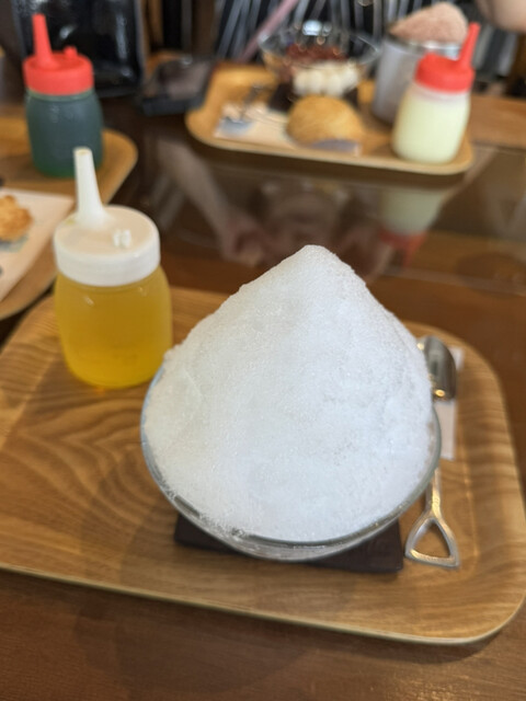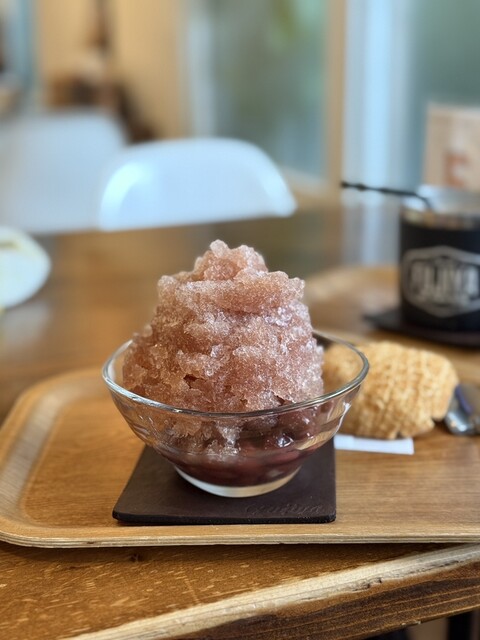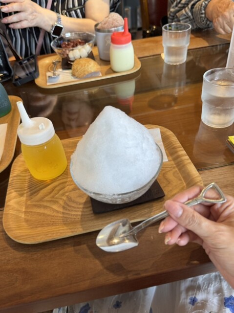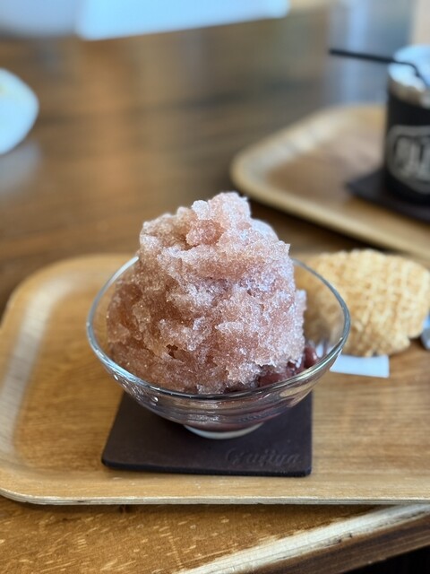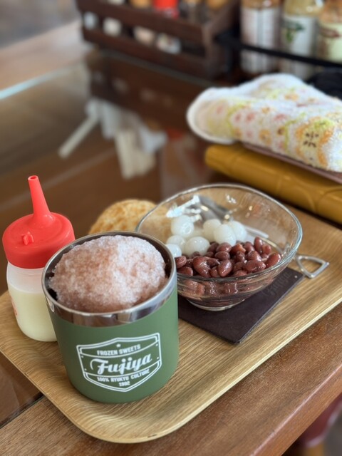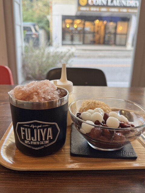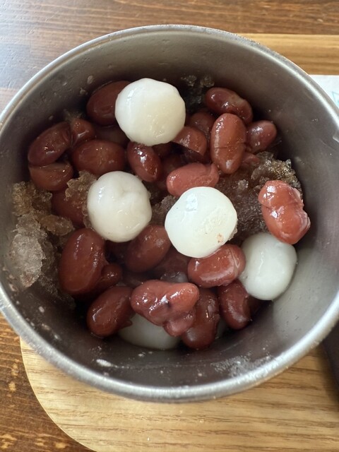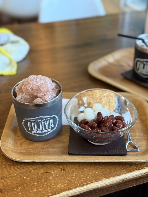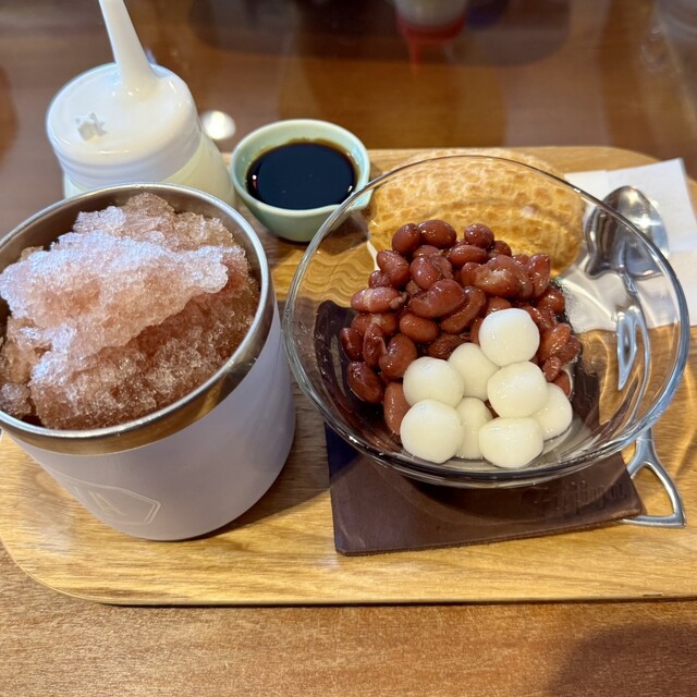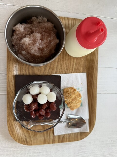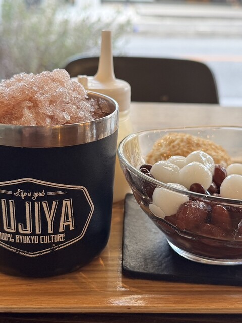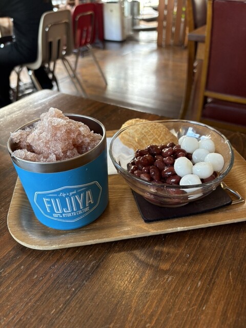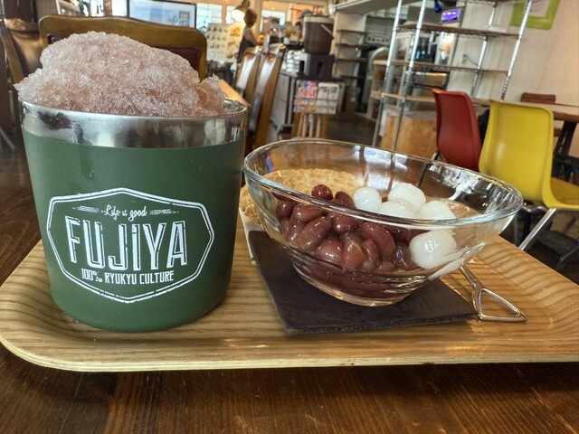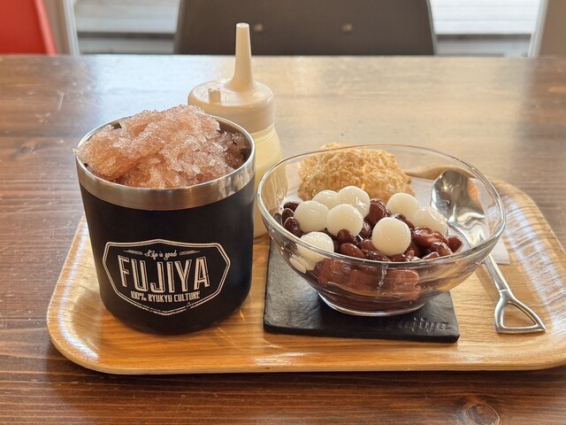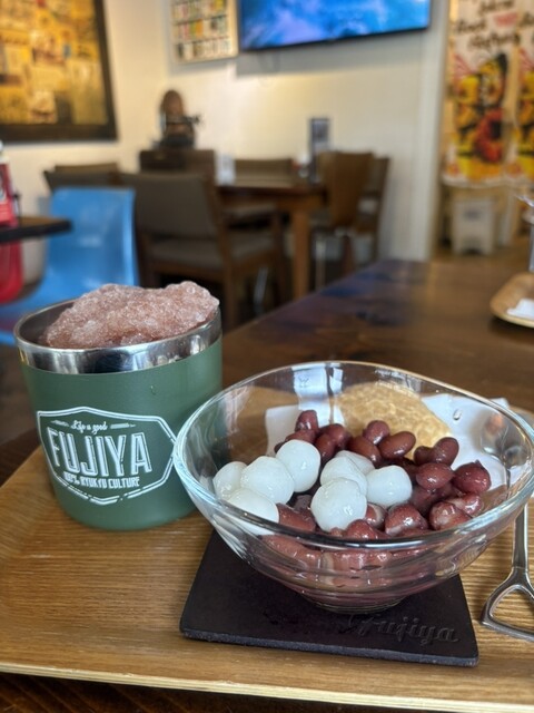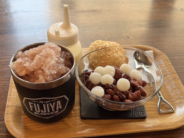 昼はサラリーマン、昼過ぎは主婦、夕方からは学生と、幅広い世代が訪れる「富士家」泊店は、“おいしいこと”と“楽しいこと”にこだわる専門店。かき氷と金時豆、付け合わせの亀せんべいのセットで差し出される「富士家ぜんざい」は、豆の煮汁を凍らせたかき氷を使用。甘みが染みたかき氷と圧力鍋でじっくり煮た金時豆の調和が見事。ツヤツヤして形がととのった金時豆は、豆そのものの甘みを残し、口の中でホロホロとほぐれる。