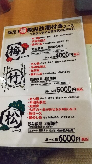 ”竹コース”には、「もつ鍋」「手羽先明太」「お刺身」「鍋のしめ(ちゃんぽんめんor雑炊」が付いています。