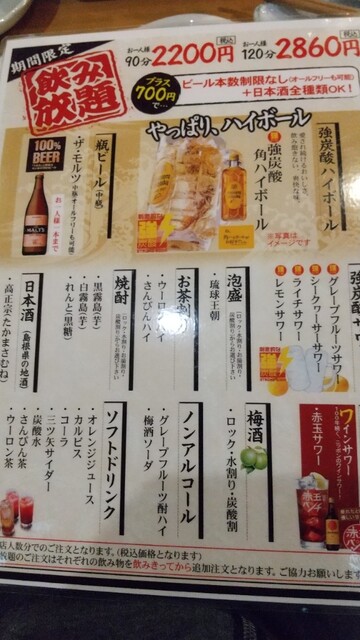 90分飲み放題の3000円コース、120分の3500円コース、180分の4000円コースがありました。