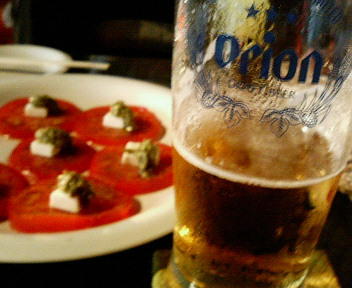 大好きなorionビールと、チーズやポテトなどのシンプルメニューで、