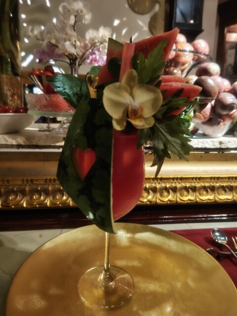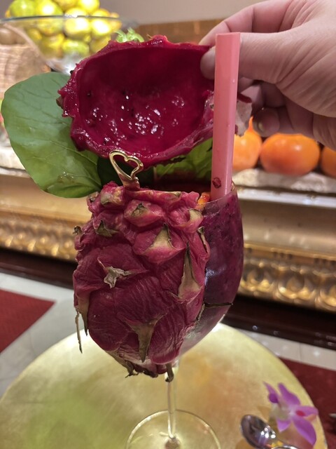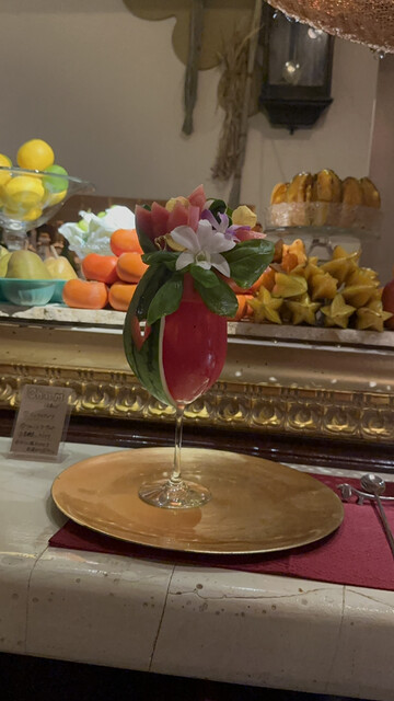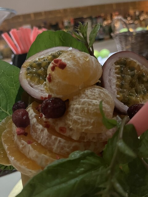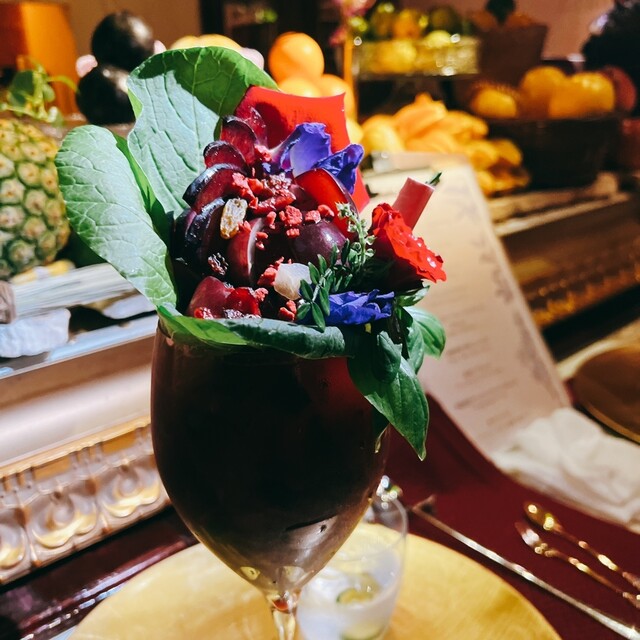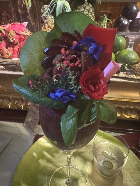 私は白桃とプラムのカクテルです。カットされたフルーツは綺麗に盛り付けられています。このカクテルの中にはウイスキー4杯程度のアルコールが含まれてい...
