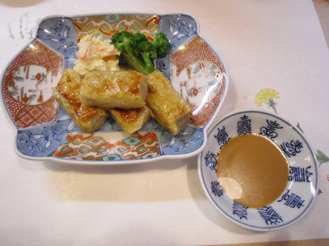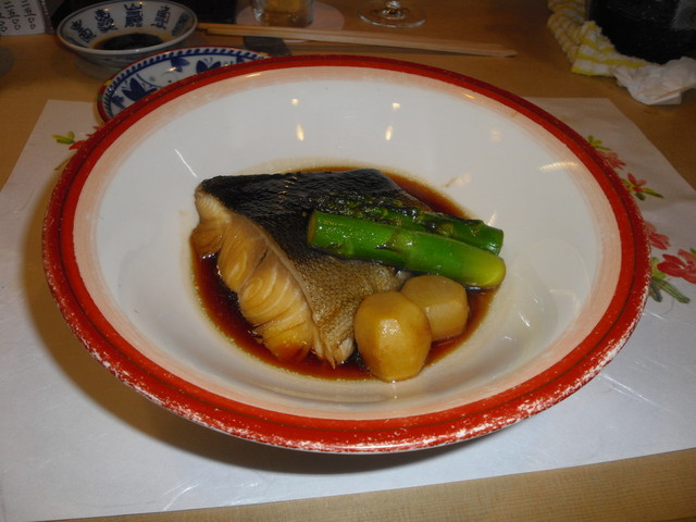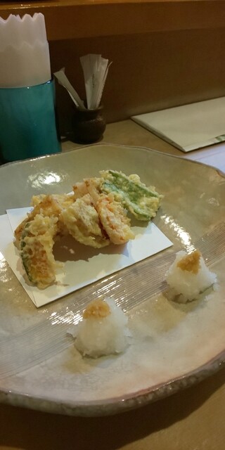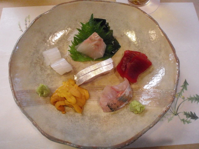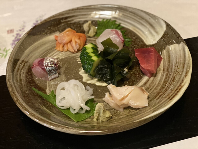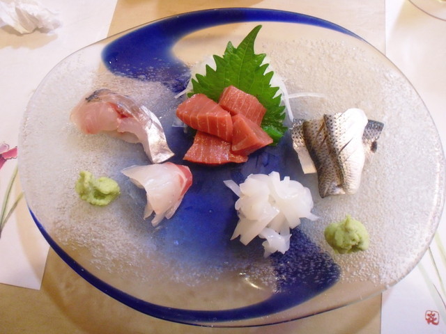 お料理はお刺身盛り合わせ、あゆの一夜干し、天ぷら盛り合わせ、鶏の治部煮をいただきました。
