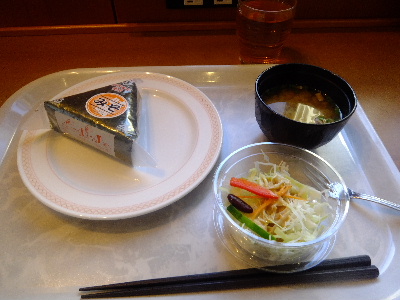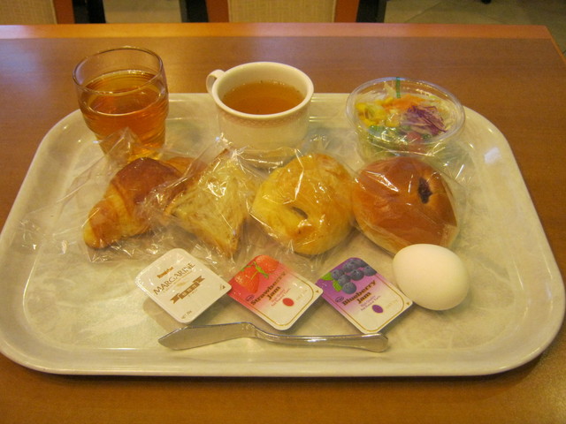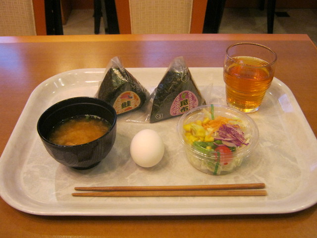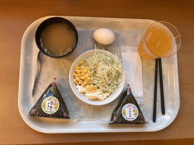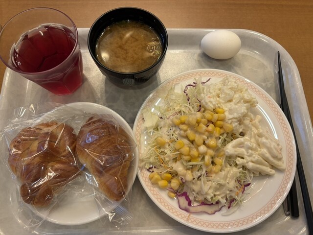 だいぶ慣れて来ましたこちらの朝ごはん。個包装のパンとおにぎりに、各種飲み物、生野菜にゆで卵といった並びは変わりません。