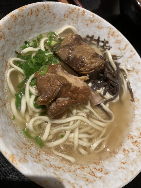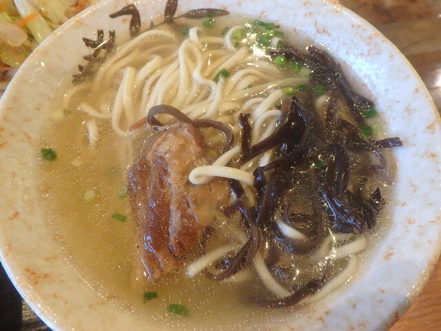 肉野菜そば。三枚肉は1枚ですが大きめの軟骨ソーキが2つと見た目のボリュームがいいですね。