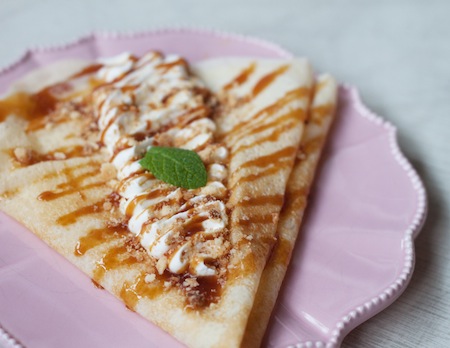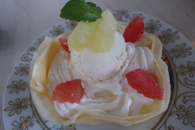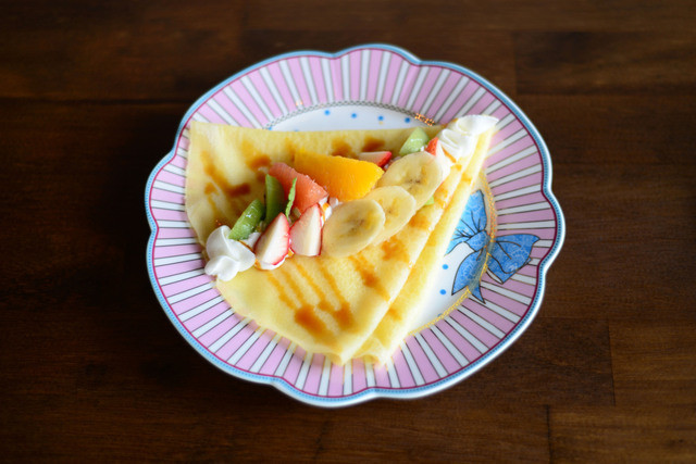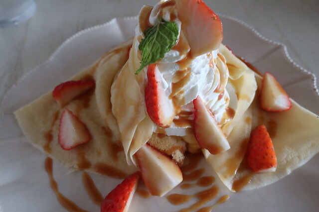 旬のフルーツのキャラメルカスタードクレープを注文。