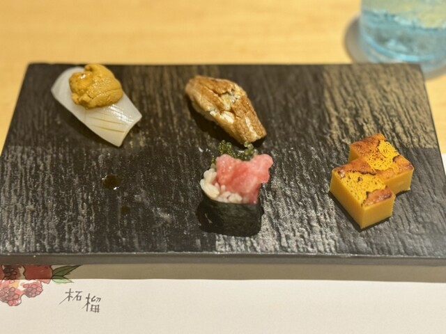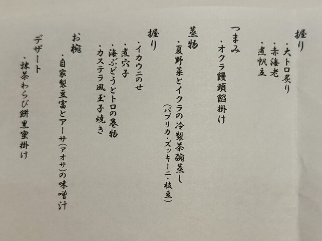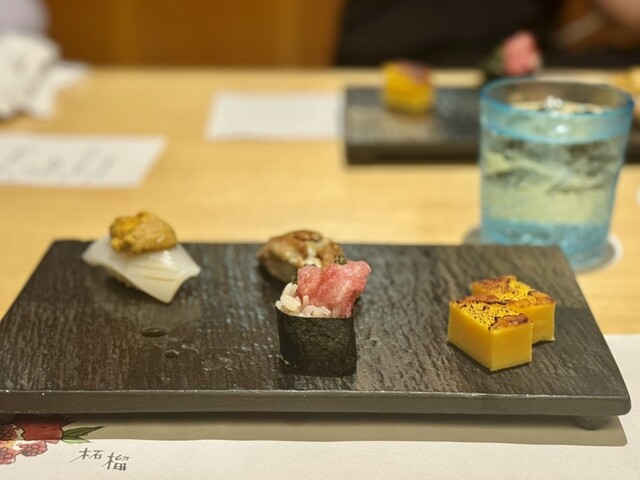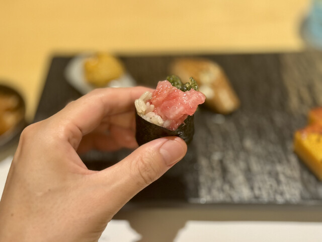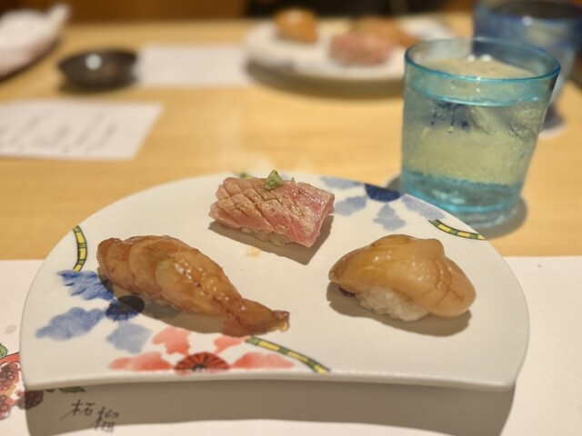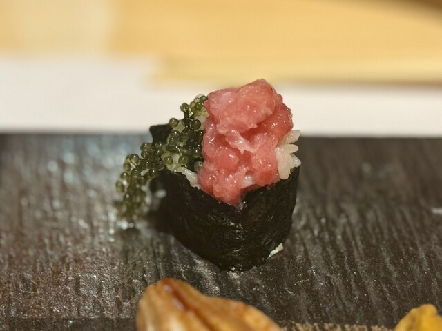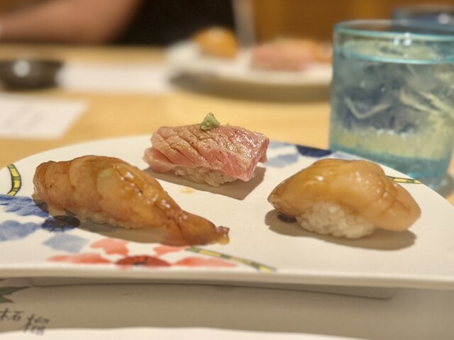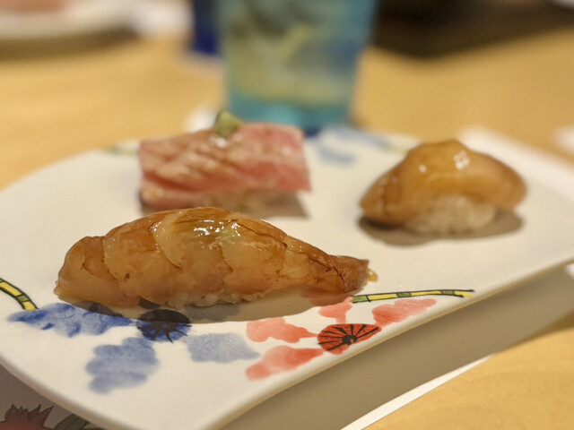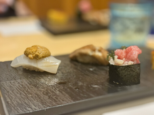 中でも、沖縄三大高級魚のマクブ、大トロ炙り、赤海老、イカウニのせが個人的な推し鮨たち。
