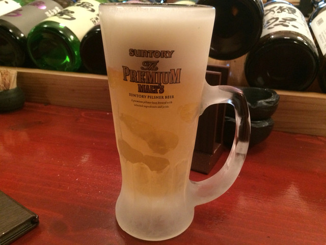 ビールは香るプレモルでおつまみ2品も結構選択肢がある中から唐揚げとレバーのたまり漬をチョイス。