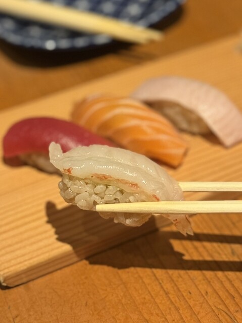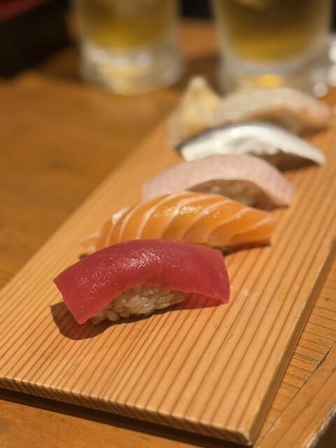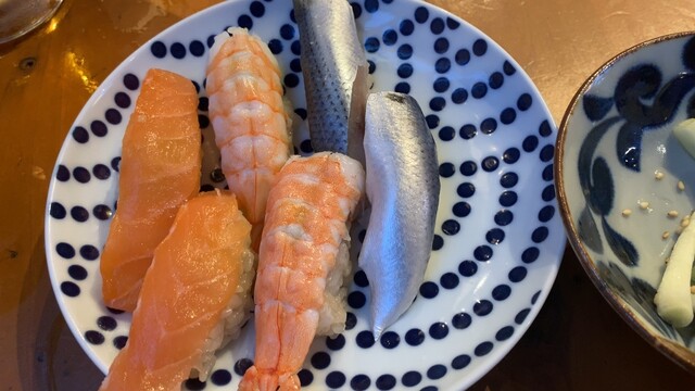寿司の盛合せは生海老、鰯、エンガワ、サーモン、鮪と人気どころが揃ってい...