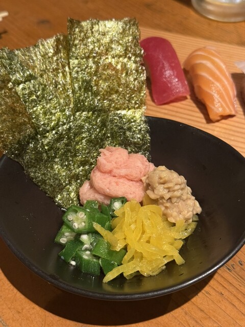 ネギトロ爆弾はたくあん、おくら、納豆、ネギトロ。海苔が3枚。