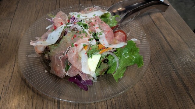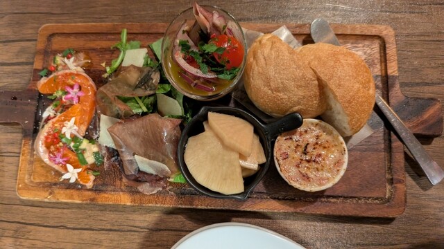 沖縄出張初日夜の2軒目利用。 1軒目の美栄橋の居酒屋を出て、もう1軒・・・ フラフラ散歩してたらちょっと裏手に入った ところで見つけました。 先約が数組入ってて、不安なく入店。 2軒目でしたので、カウンターでいただいたのは 中重口タイプの赤ワイングラス。(¥500) おつまみは、前菜の盛り合わせ(¥900)と 燻製チーズ(¥480?) 前菜の盛り合わせみたいに、いろいろな... 詳細を見る