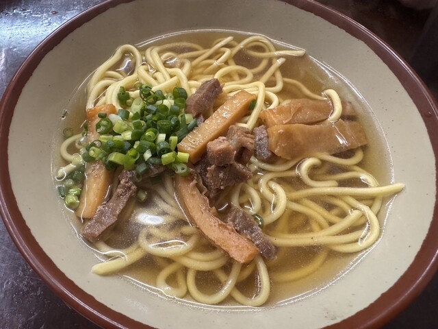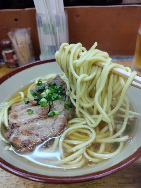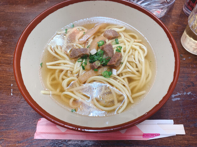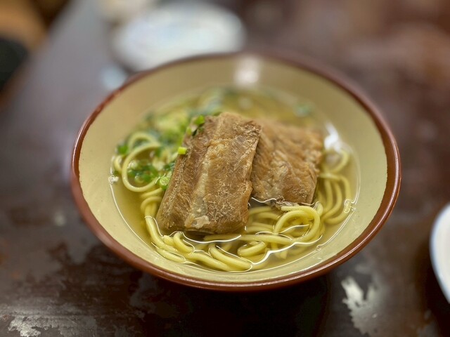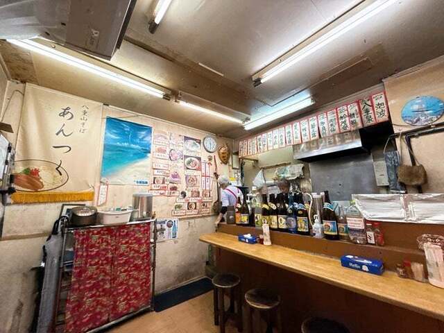 今や八重山そばの特徴にもなっている丸麺を生み出した金城製麺所の麺を石垣島から直送、本場の八重山そばを味わうことができます。むつみ橋通りを公設市場向けに行くと、八重山そばのノボリとオリオンビールのちょうちんが目印です。石垣島直送八重山そばとソーキそばをメインに提供しています。夜は八重山産の泡盛(グラス350円~)などを飲みながら、日替わりのおつまみが楽しめます。時には三線ライブなどもあり島唄をBGM...に心地よい時間を過ごすことができます。