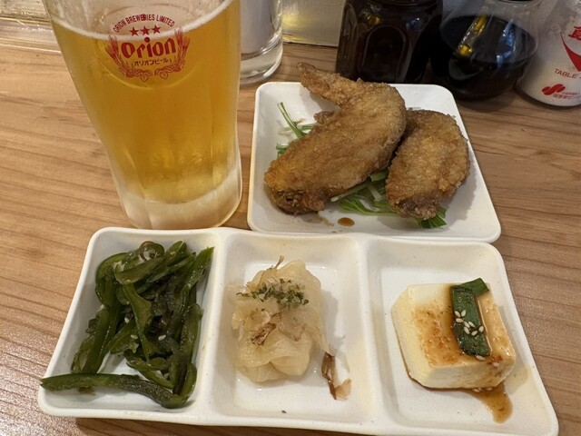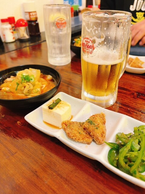 土曜日の夕方、19:00頃訪問しました。 お客の入りは9割くらいでしょうか。ちょうどカウンターが開いていたので、そこに案内され着席。 前金で1,200ベロを注文します。 ドリンク1杯目は生ビールを注文。サザンスターではなくオリオンドラフトなのが嬉しいです。 フードはおまかせで2品提供されます... 詳細を見る
