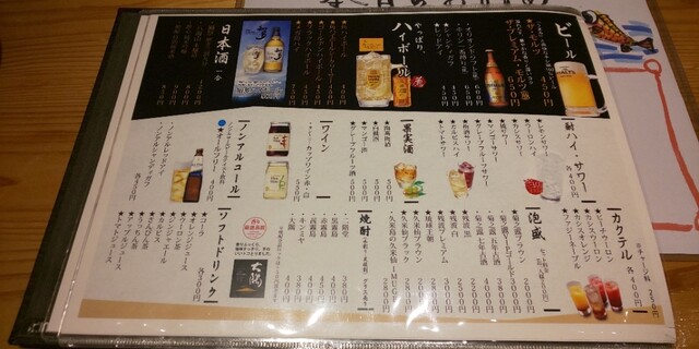 | ドリンク | 日本酒あり、焼酎あり、ワインあり、カクテルあり |