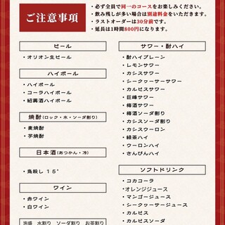 オリオン生ビール ハイボール コーラハイボール 紹興酒ハイボール 麦焼酎 芋焼酎 月桂冠 鬼殺し 赤ワイン 白ワイン 残波黒 久米仙ブラウン 菊之露ブラウン 酎ハイプレーン レモンサワー カシスサワー シークヮーサーサワー カシスウーロンサワー カルピスサワー 巨峰サワー 梅酒サワー 梅酒ソーダ割り ウーロンハイ さんぴんハイ 緑茶ハイ コカ・コーラ 果汁100%オレンジジュース マンゴージュース シークヮーサージュース カルピス カルピスソーダ ウーロン茶 さんぴん茶 緑茶 |