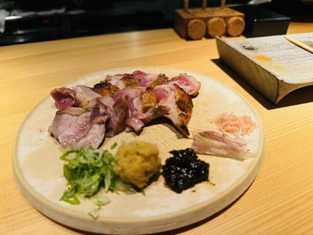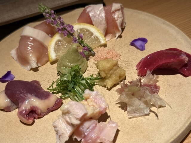 お店の二大看板とも言える『鳥刺し盛り合わせ』と、厳選された『焼き鳥串』を数種類いただきました。まず供された鳥刺しは、...