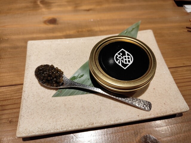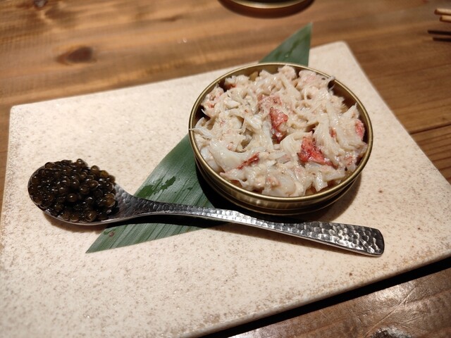 【看板メニュー】ウニを混ぜ込んだシャリにカニとキャビアがのった贅沢な一品を 始めとする当店がおススメする旬の高級食材を使用した、 前菜、蒸し、揚げ、焼き、土鍋ごはん、お椀の計10品と紬で是非食べてもらいたい全てを詰め込んだ大満足のコース。お一人様9,300円(税込)のコースとなります。