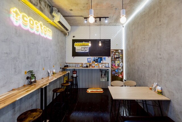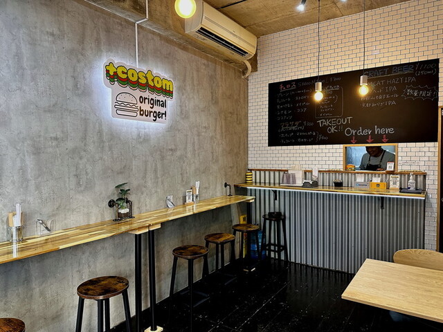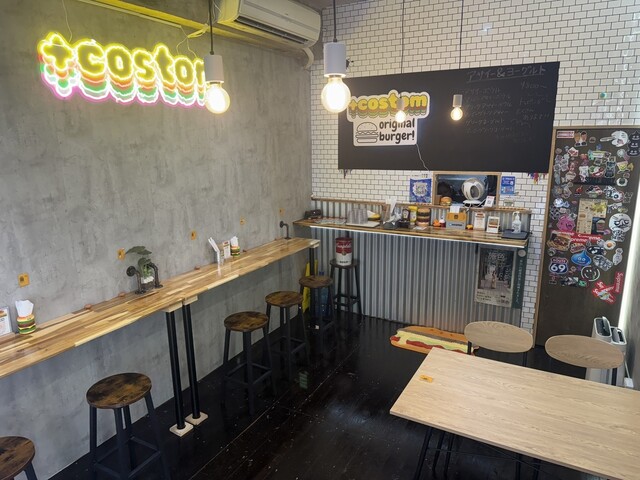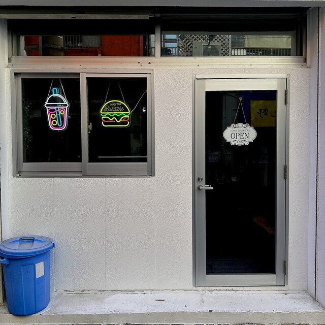 場所は前島、8/1にオープンしたとのこと。ファサードはバーガーのネオンが目印、こじんまりとした店舗スペースにカウンター6席、2名テーブル、4名テーブルが一つずつといったレイアウト。