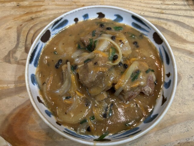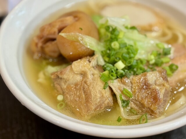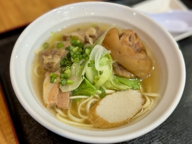 午前中の視察終了して空港到着。ランチは各自手配と言われたので、この旅で食せてないソーキそば、目指します!空港国内線4階のお店並ぶ辺りを探して、事前候補の一軒、天龍さん発見!即入店の可否確認するとOK!テーブル席を自由使い!メニュー見ると単品と定食があり、定食にはジューシーと小鉢三つ付とのこと。ジューシーは朝食にてゲット済み!ソーキそば単品935円を発注!まもなくすると着丼!豚あばら肉であるソーキ量...