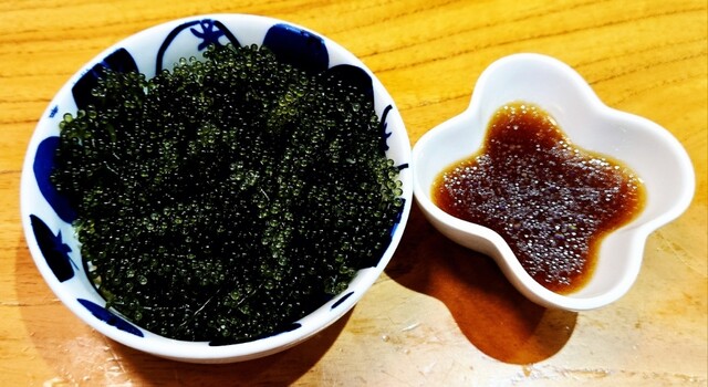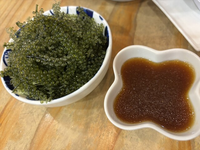 入った時は単品少しを2人で分けるつもりで海ぶどうとてびちとゴーヤチャンプルーのジューシーセットを注文。
