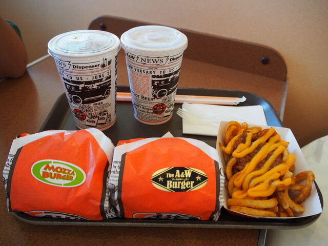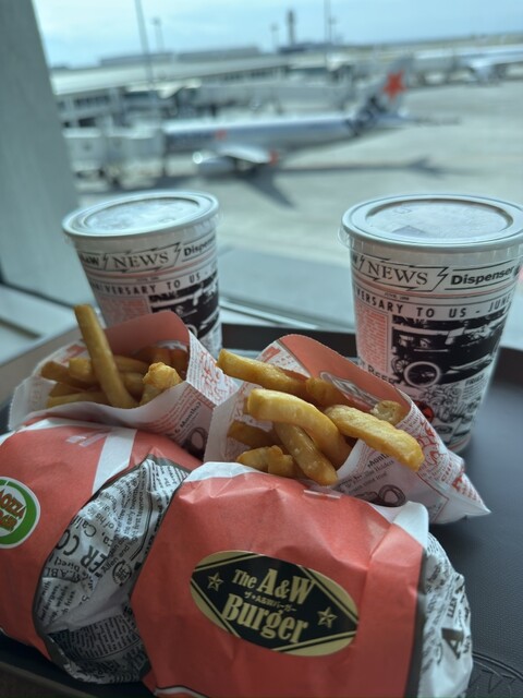 沖縄のハンバーガーといえばA&W。とりあえず初沖縄なのでベタなところは行っておこうと(笑)那覇空港にある店舗は滑走路が見えて眺めがいいと見たので、飛行機乗る前に駆け込みεε=(((((ノ・ω・)ノ
