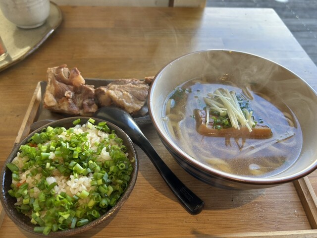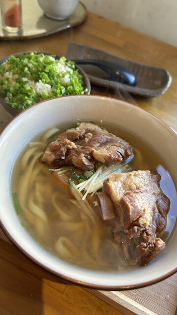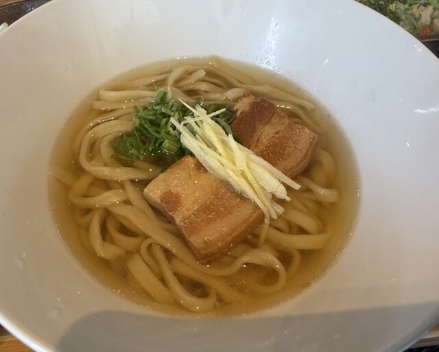 沖縄そばを美味しくたべてもらいたいと、麺は自家製の手打ち麺を2日間寝かせて熟成させた麺を使用。独特な歯ごたえがあるが、強すぎないコシとやわらかな弾力の麺は、じっくり時間をかけて仕上げた透明でスッキリとしていてコクがあるスープとの相性抜群。麺は細麺と太麺の2種類から選べるのもうれしい。売切れ次第閉店なのでお早めに。