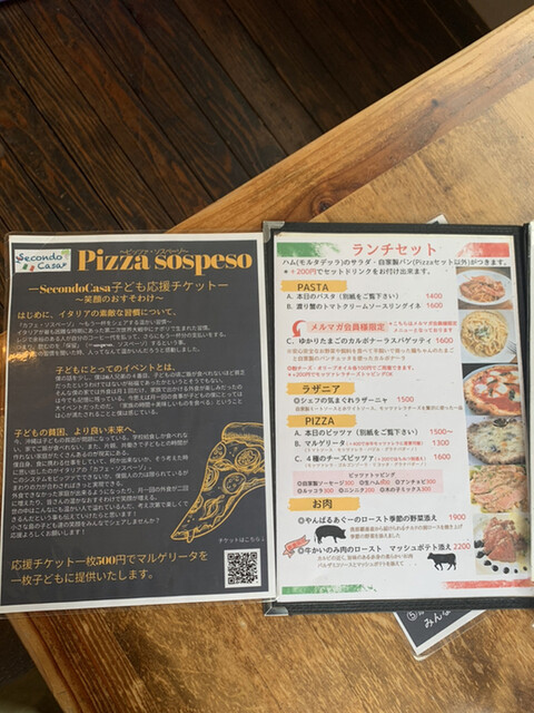 以前ディナーで伺って美味しかったのでランチに来ました。2人だったので取り分けコース(2名で4400円)をオーダー。パスタやピザ、ラザニアから2品選べ、メインのお肉、サラダとフォカッチャがついてくるというお得なセットです。