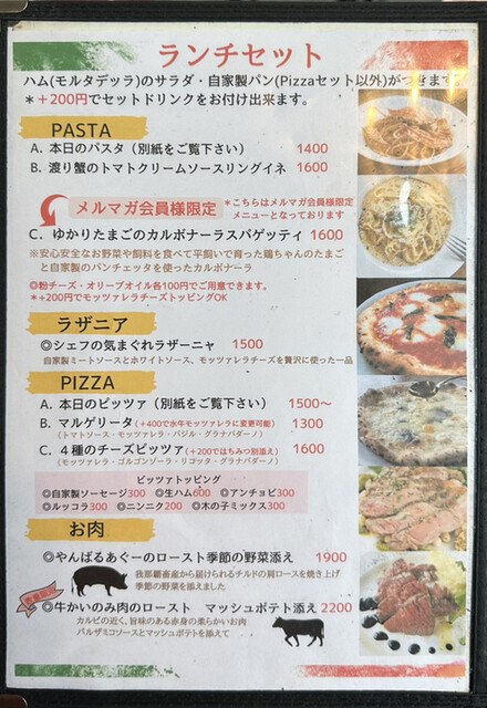 以前ディナーで伺って美味しかったのでランチに来ました。2人だったので取り分けコース(2名で4400円)をオーダー。パスタやピザ、ラザニアから2品選べ、メインのお肉、サラダ...