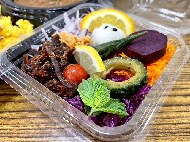 チキントマトカレーはいろいろな副菜がたっぷりと盛り付けられた鮮やかなワンプレートです。