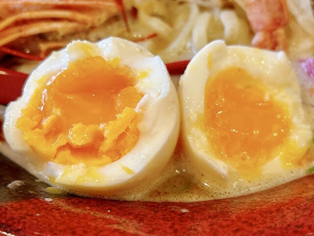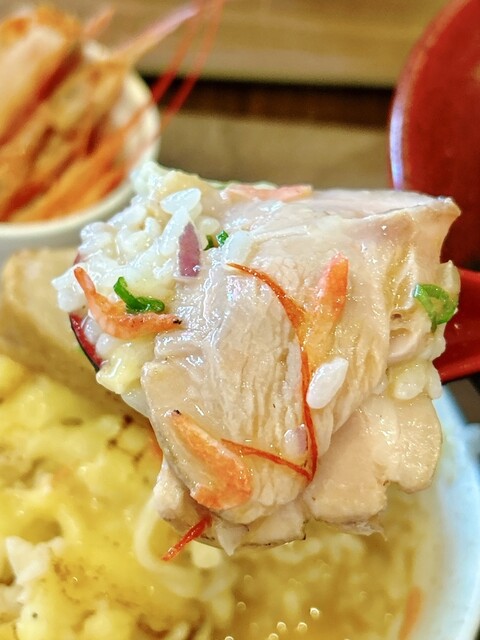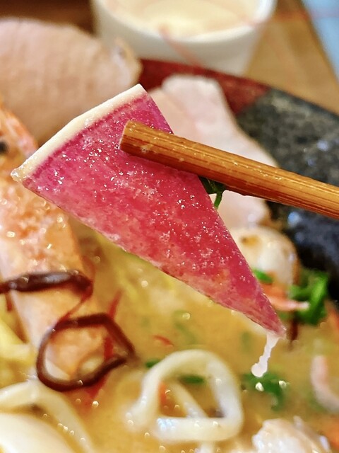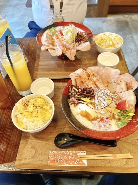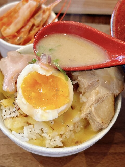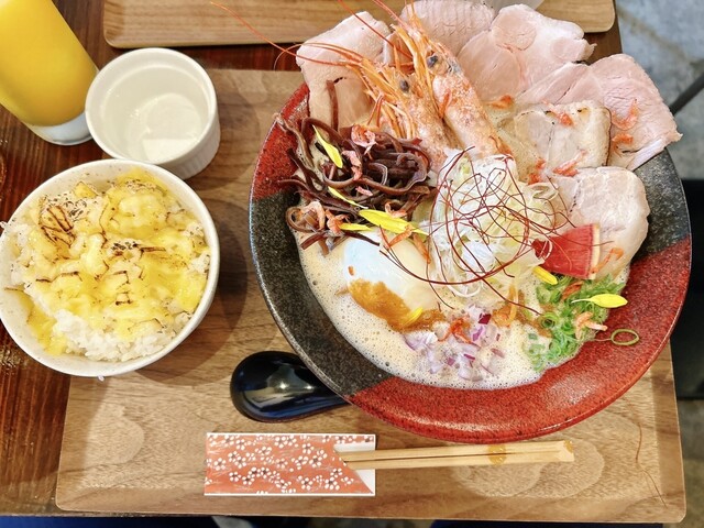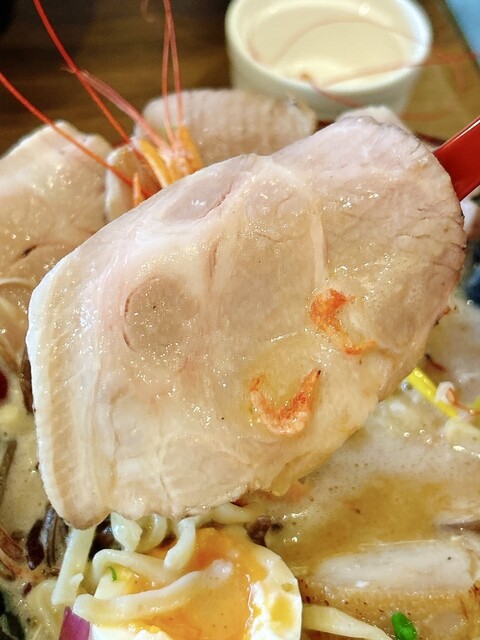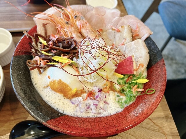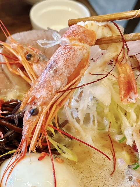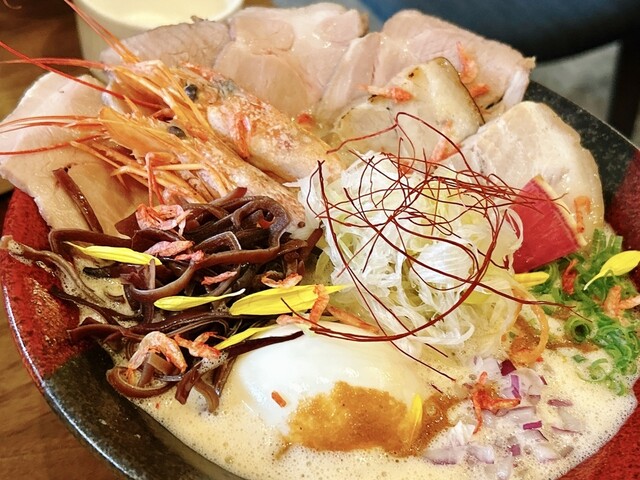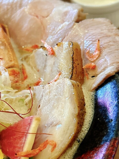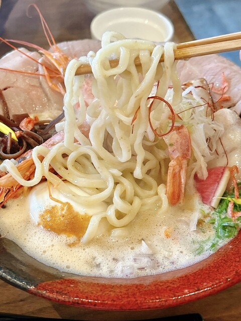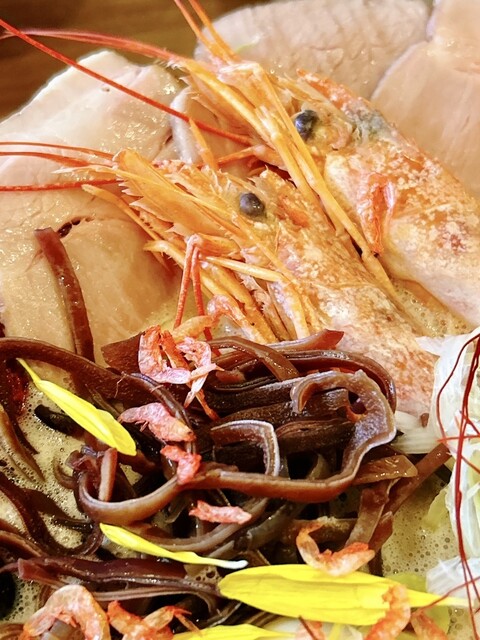 豚骨と海老出汁、桜海老まで散りばめた、香り豊かな濃厚スープです。