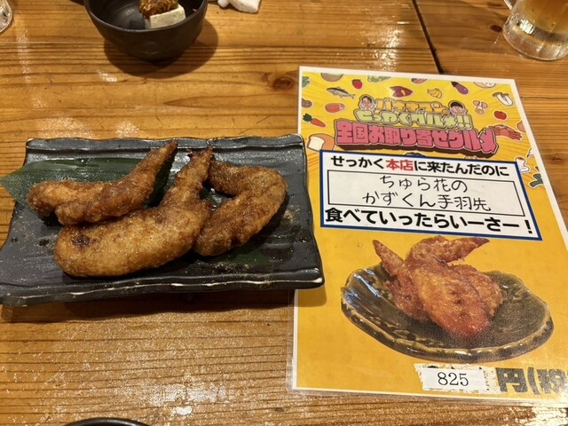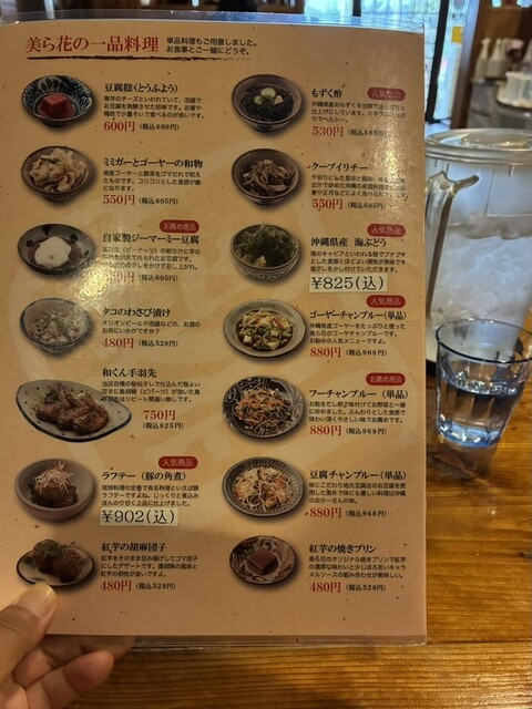 名護の「美ら花」へ。沖縄料理の定番が一通り揃っていて、観光でも地元飲みでも使いやすい居酒屋でした。店内は木のテーブルで落ち着いた雰囲気、ほどよく賑やかで入りやすい空気感。