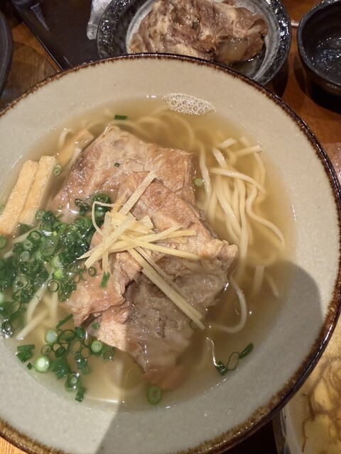 沖縄そばは、三枚肉、軟骨ソーキ、本ソーキがトッピングされています。