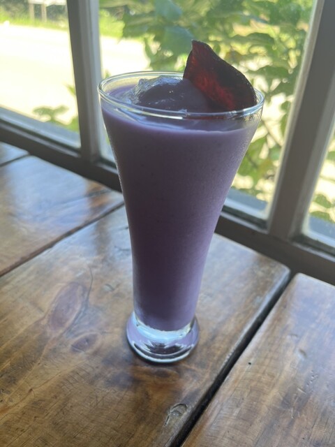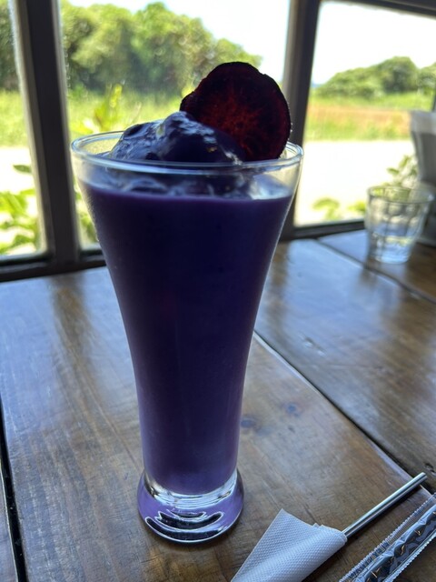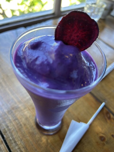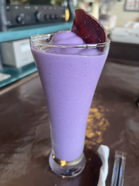 紅芋の澱粉が功奏して、クラッシュドアイスと共に硬めのコロイド状を為しています。シェイクほど強く無くストローにて吸い出せます。蜂蜜?が紅芋を補強してとてもリッチな味わいに酔いしれます。トピングのチップスは既製品かと思われるものの、ぱりっと心地よい歯触りをもたらします。この紫を目にするだけでも価値があります。とても美味しゅう御座いました。