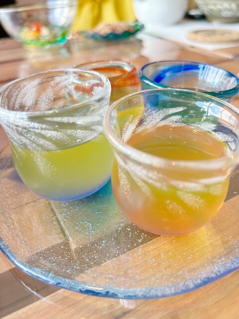 ほとんどの器が琉球ガラスで、見ているだけで癒やされます。